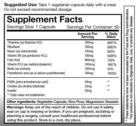 B Vitamins are essential for the normal functioning of the nervous system and help people who suffer from stress and fatigue by supporting healthy relaxation and energy levels. B Vitamins generally should be taken together. All B Vitamins are water soluble; therefore any excess will be eliminated via the urine and should be supplemented on a daily basis.